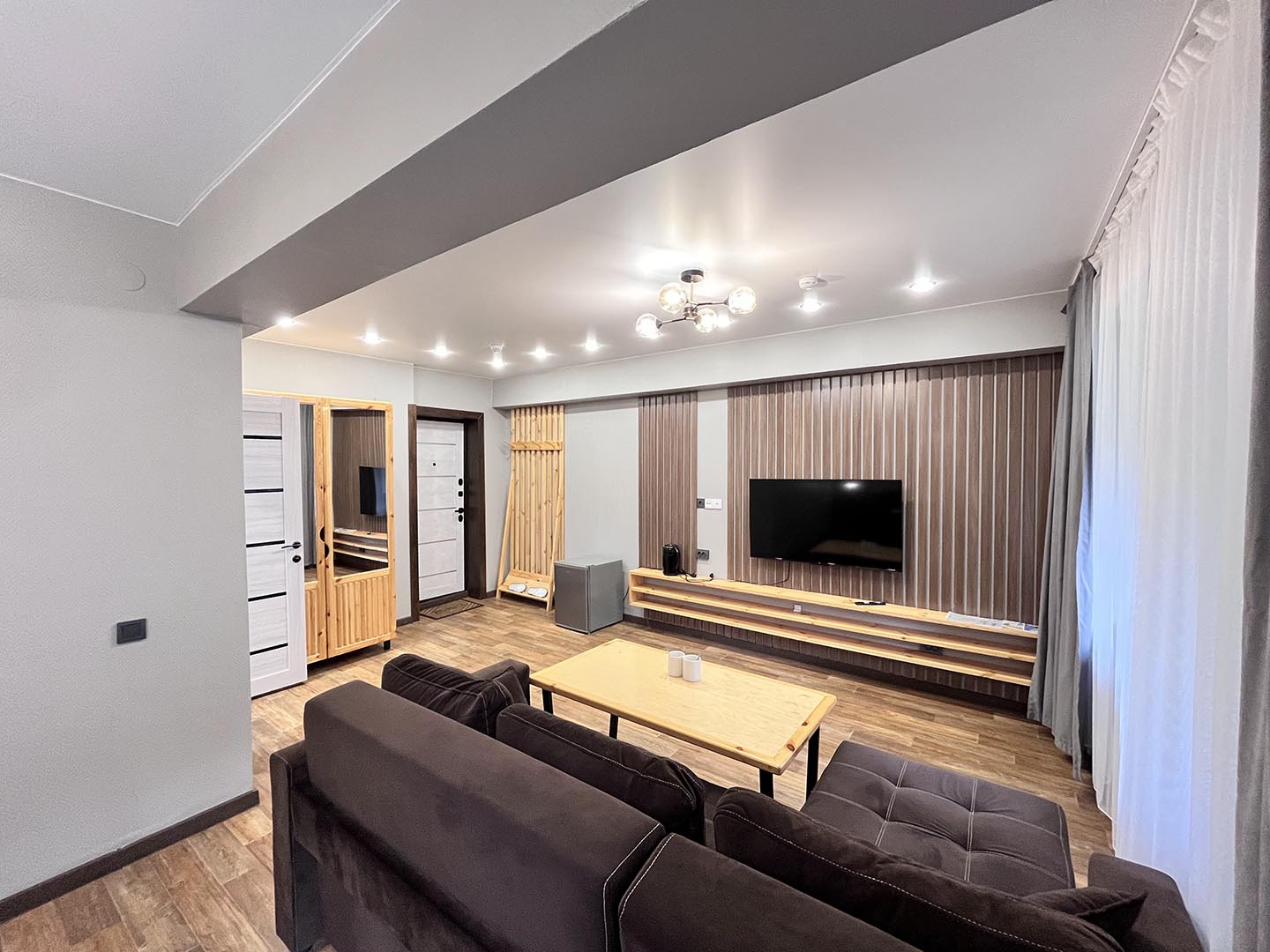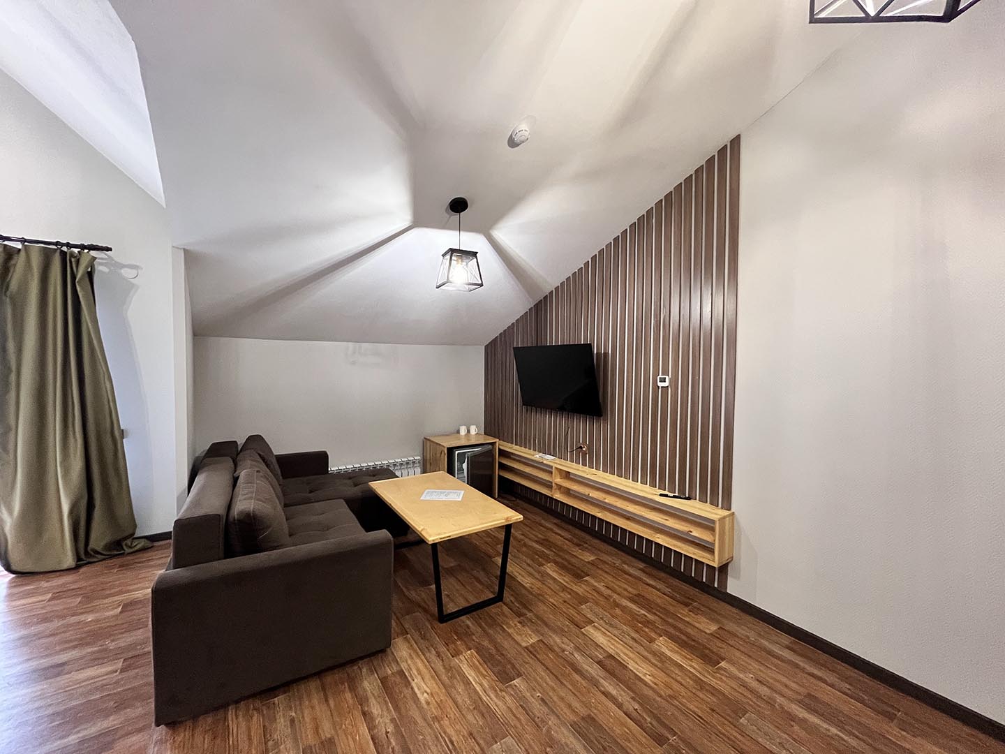 Совершенно новый номер в новом отеле, расположенный на втором этаже. Зайдя в номер, Вы сразу попадаете в большую комнату — «гостиную». В комнате имеется угловой диван, журнальная зона перед телевизором, чайник и холодильник для напитков. Спальная зона в номере представлена в виде отдельной комнаты с двуспальной кроватью.