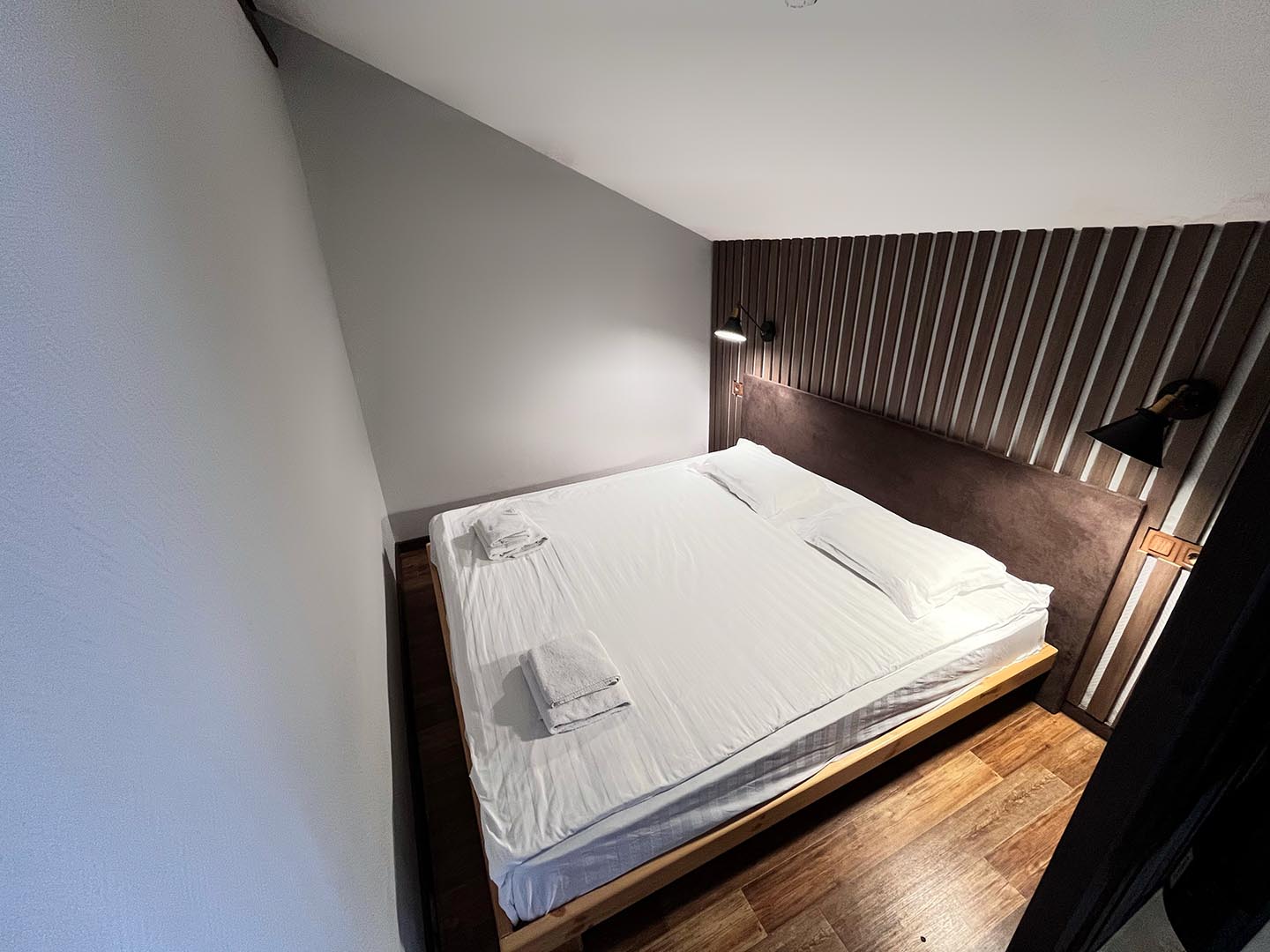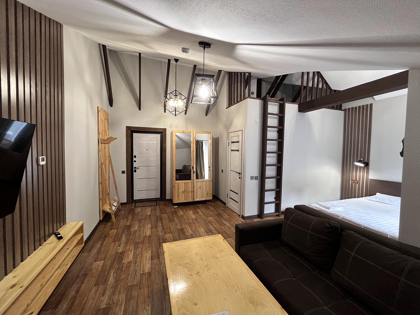 Совершенно новый номер в новом отеле, расположенный на втором этаже. Зайдя в номер, Вы сразу попадаете в большую комнату — «гостиную». В комнате имеется угловой диван, журнальная зона перед телевизором, стойка для спортивного инвентаря, чайник, микроволновая печь и холодильник для напитков. Спальная зона в номере представлена в виде отдельной комнаты с двуспальной кроватью.