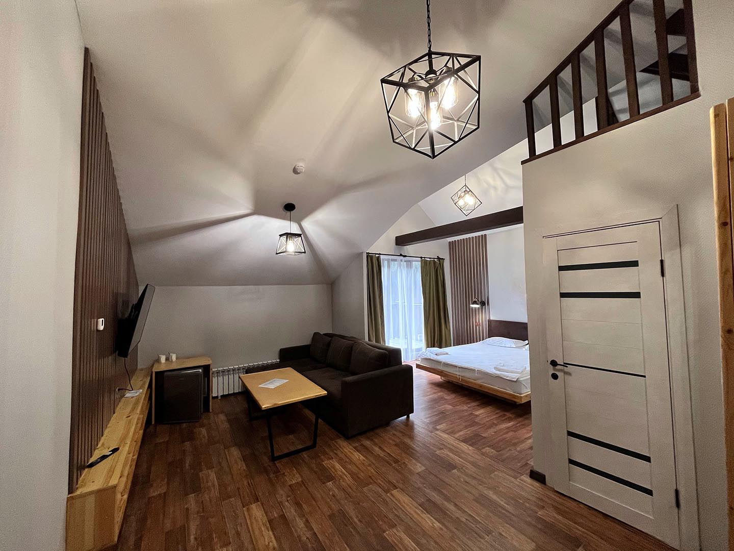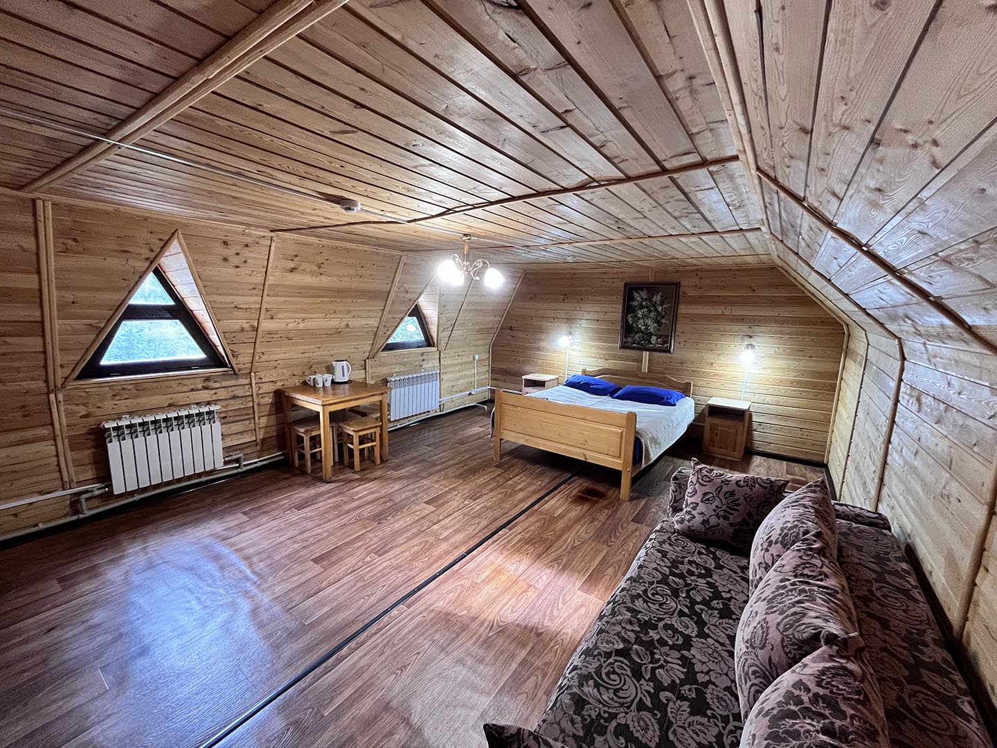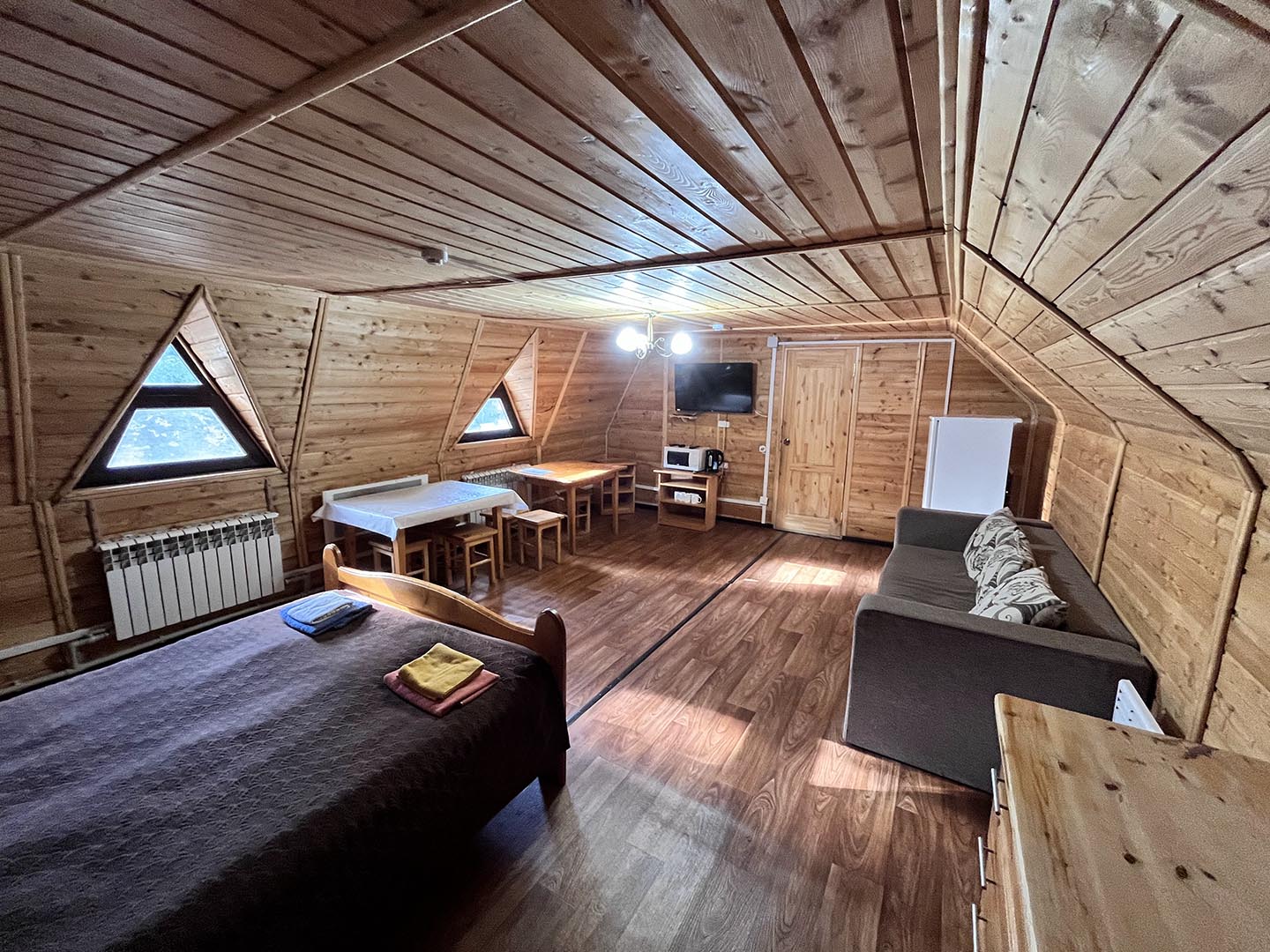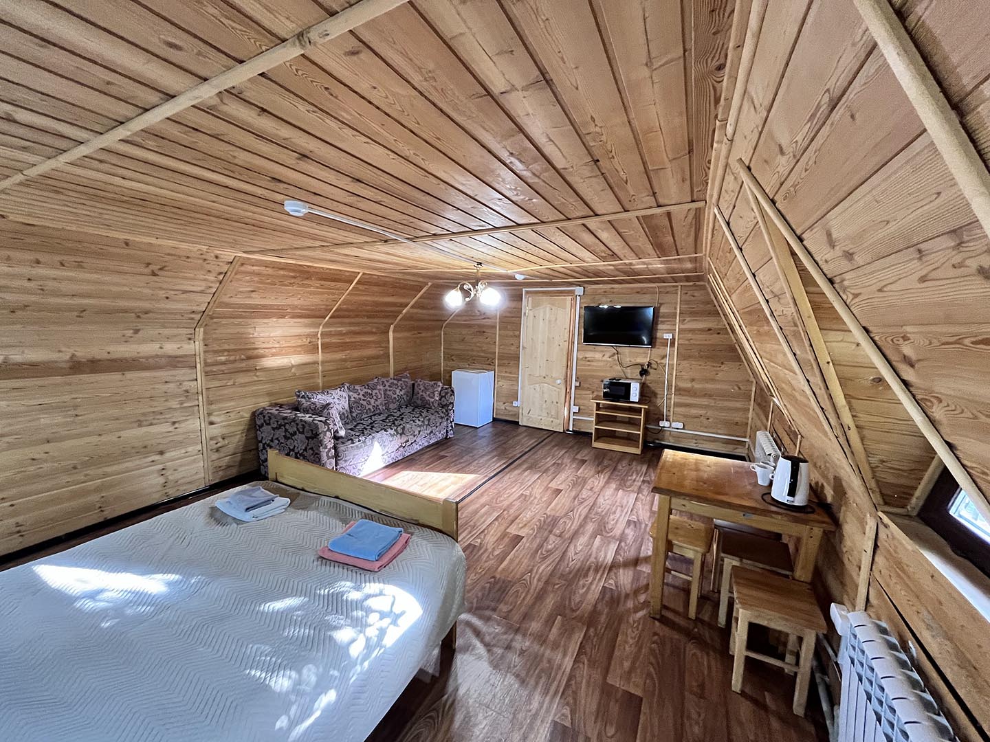 Номер располагается на втором этаже уютного Альпийского домика. В номере есть всё необходимое для комфортного отдыха в любое время года. Для организации спальных мест имеется двуспальная кровать, с прикроватными тумбочками для хранения необходимых принадлежностей, и раскладной диван. В данном номере есть ТВ со спутниковым телевидением, холодильник, деревянный стол со стульями, электрический чайник и чайные пары. В номерах расположена ванная комната с душевой кабиной, раковиной и санузлом. Также в номере имеется сушилка для одежды. Постельное белье и полотенца входят в стоимость номера.