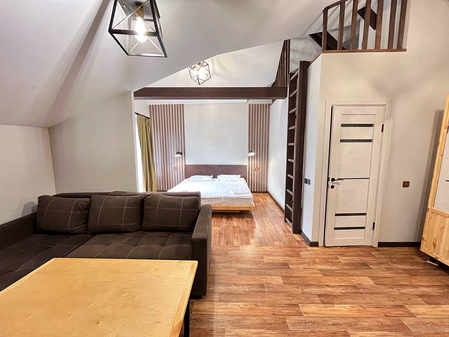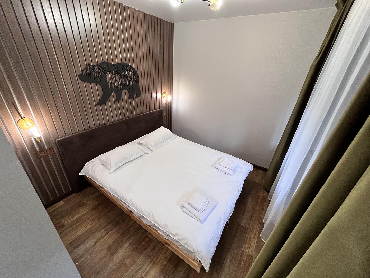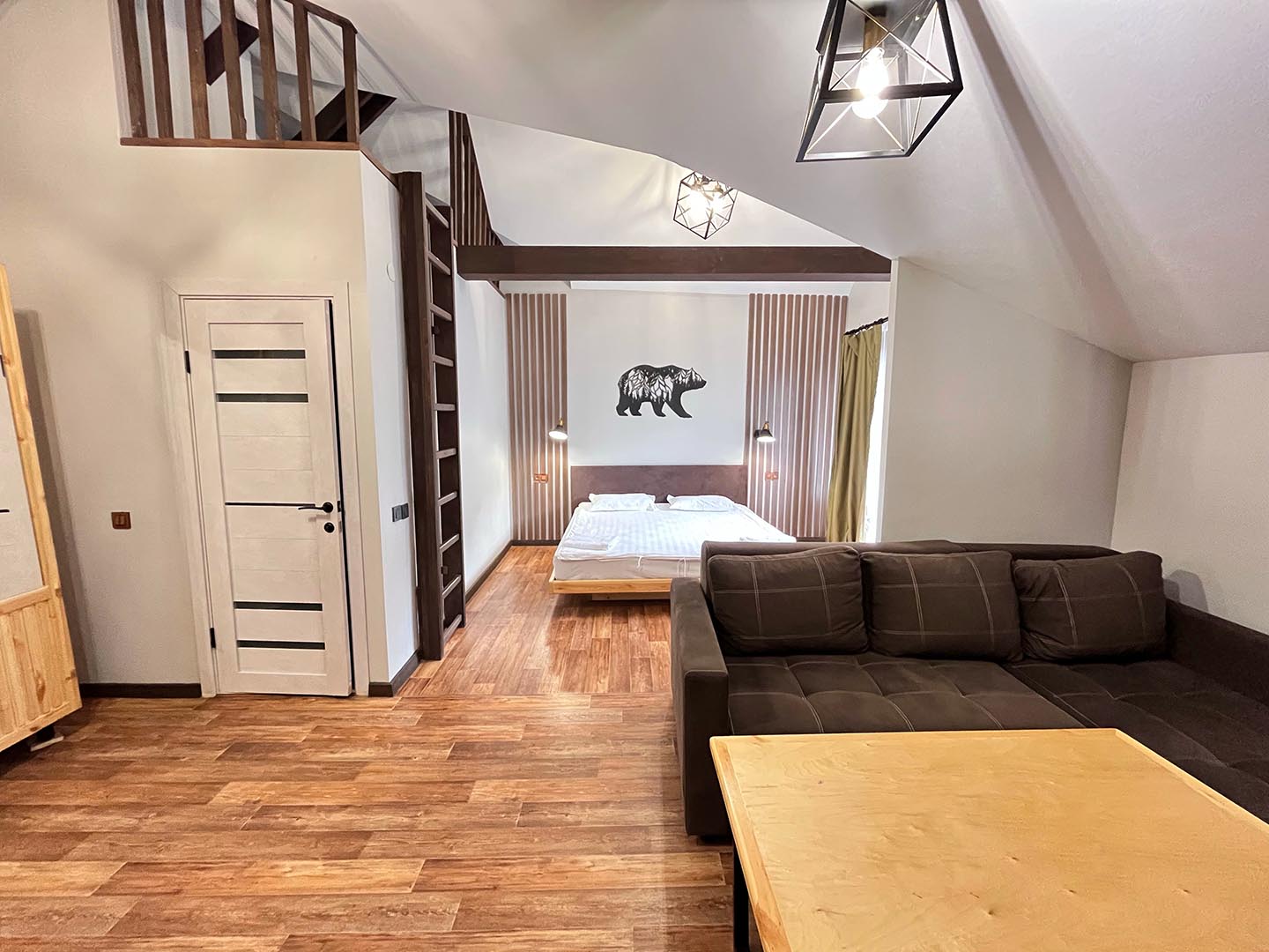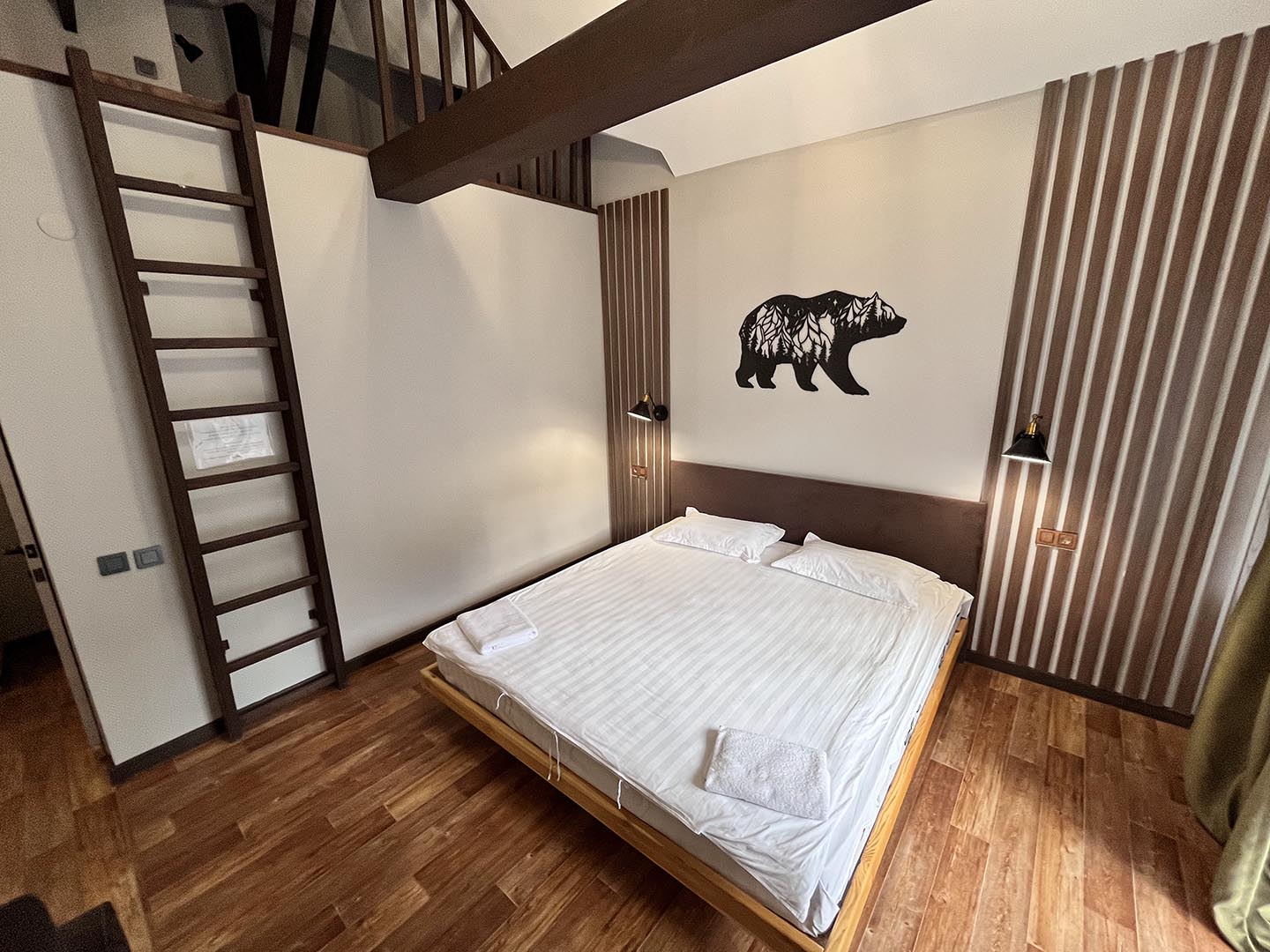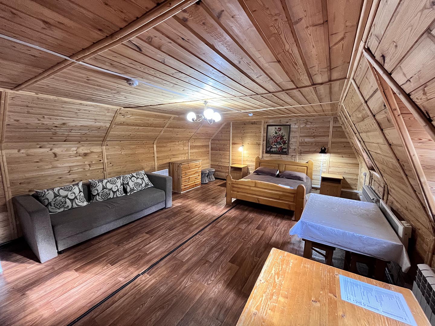 Номер располагается на втором этаже уютного Альпийского домика. В номере есть всё необходимое для комфортного отдыха в любое время года. Для организации спальных мест имеется двуспальная кровать, с прикроватными тумбочками для хранения необходимых принадлежностей, и раскладной диван. В данном номере есть ТВ со спутниковым телевидением, холодильник, деревянный стол со стульями, электрический чайник и чайные пары. В номерах расположена ванная комната с душевой кабиной, раковиной и санузлом. Также в номере имеется сушилка для одежды. Постельное белье и полотенца входят в стоимость номера.