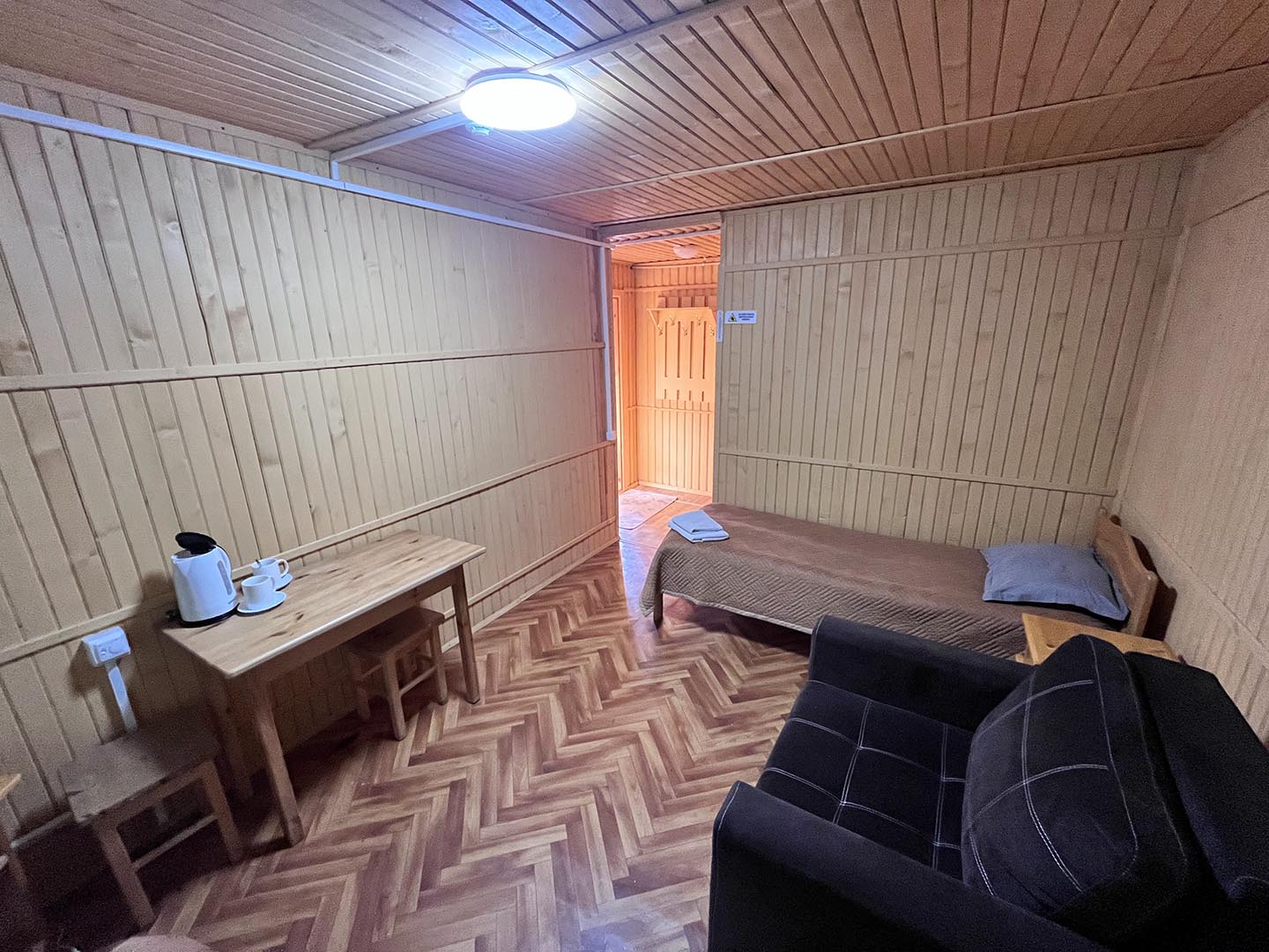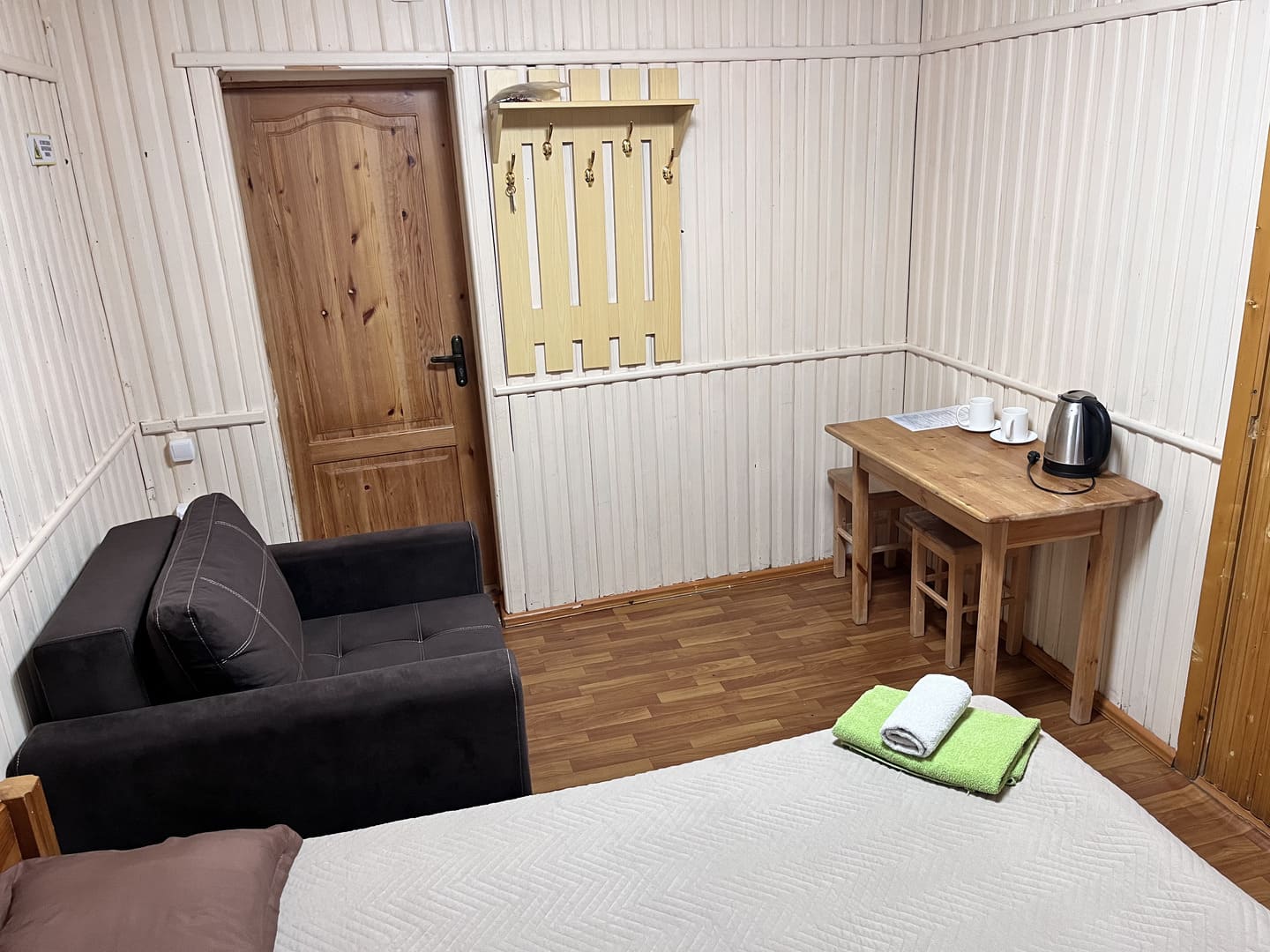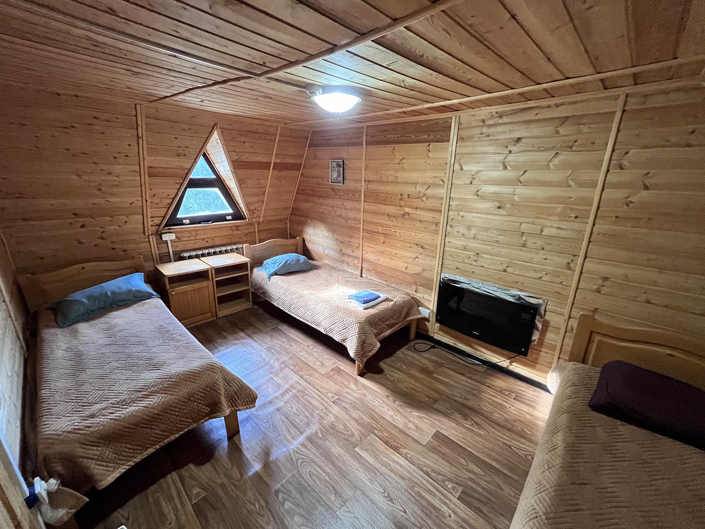 Для организации спальных мест, в номере располагаются 2 деревянные односпальные кровати. Для каждой кровати отведена отдельная тумбочка, в которую можно сложить необходимые принадлежности. У входа расположена вешалка для одежды, зеркало. Душа и санузла в номере нет, удобства находятся на первом этаже. Также в номере имеется деревянный стол со стульями и сушилка для одежды. Постельное белье входит в стоимость номера.