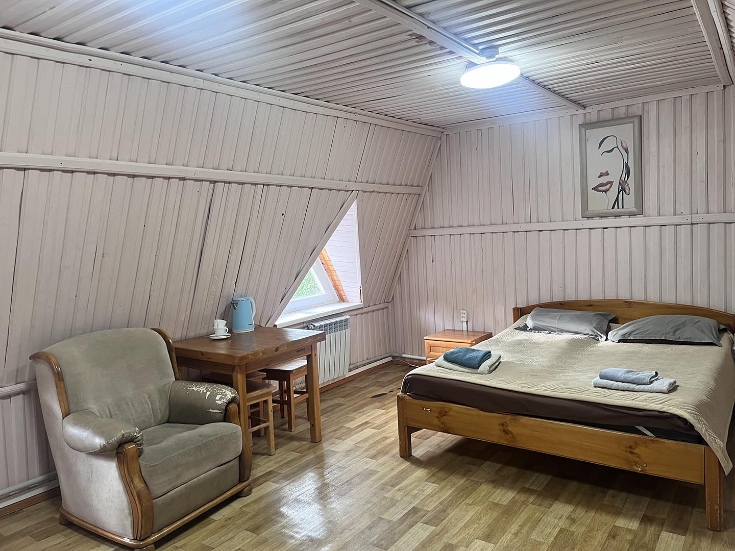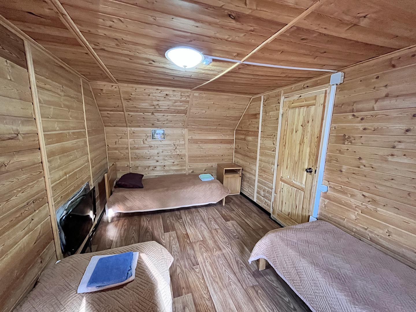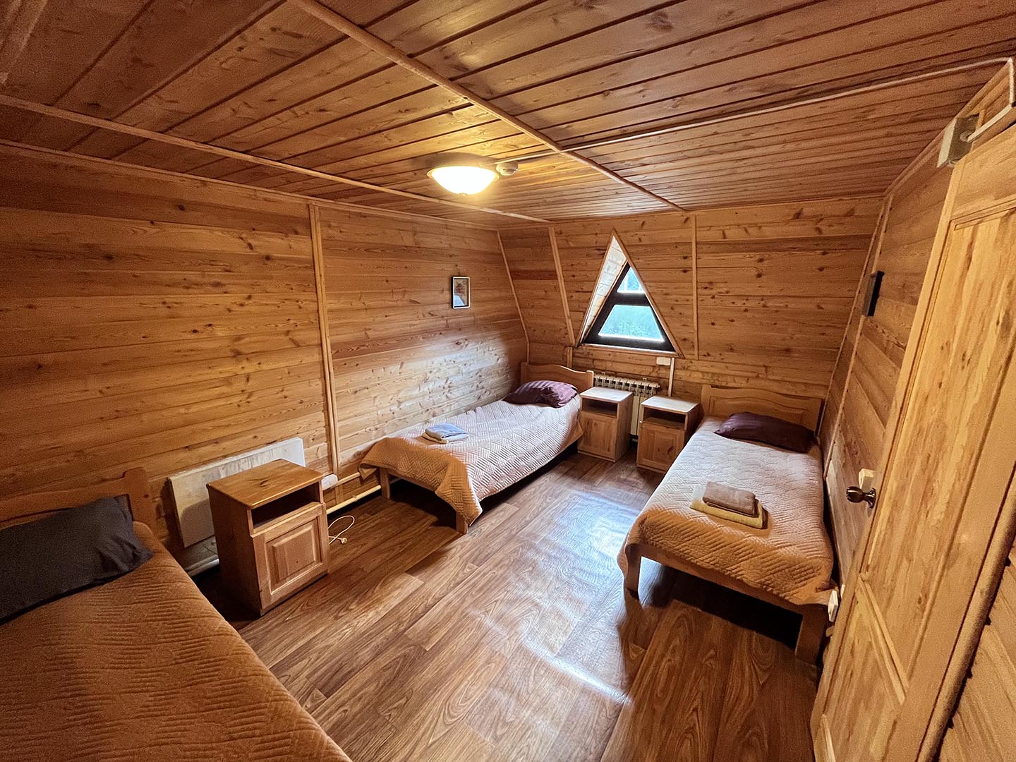 Для организации спальных мест, в номере располагаются 2 деревянные односпальные кровати. Для каждой кровати отведена отдельная тумбочка, в которую можно сложить необходимые принадлежности. У входа расположена вешалка для одежды, зеркало. Душа и санузла в номере нет, удобства находятся на первом этаже. Также в номере имеется деревянный стол со стульями и сушилка для одежды. Постельное белье входит в стоимость номера.