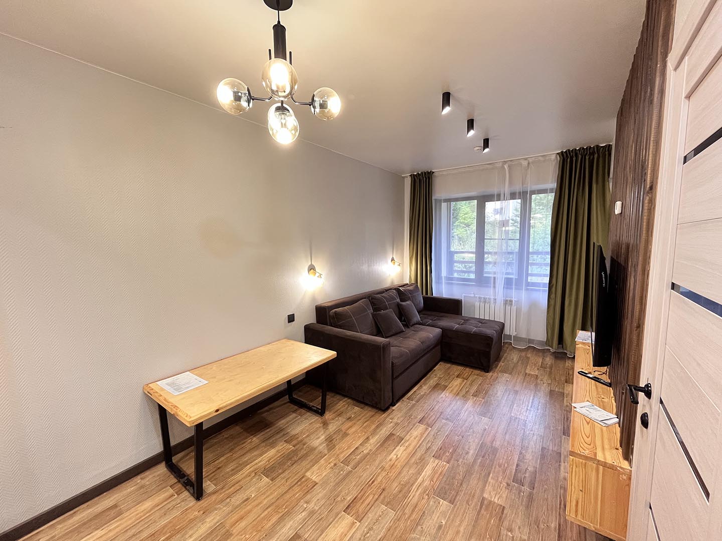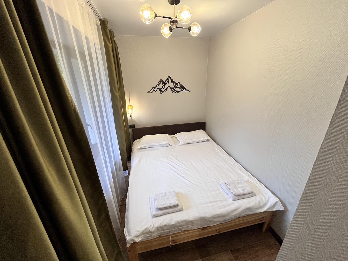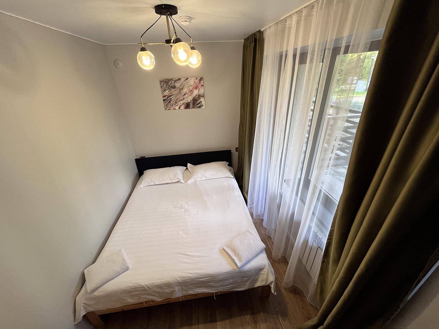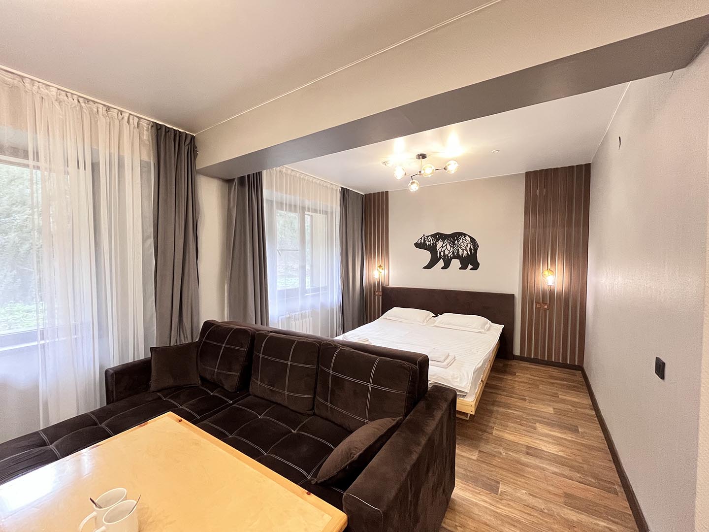 Уютный и комфортный номер с отдельным входом. Расположен на первом этаже Альпийского домика. В номере есть прихожая зона, из которой Вы сразу попадаете в большую комнату — «гостиную-спальню». В комнате имеется удобная двуспальная кровать с прикроватными тумбочками для хранения необходимых принадлежностей, большой телевизор и раскладной диван. В номере также имеется холодильник, микроволновая печь, чайник и необходимая посуда — чайные пары, стаканы. В номере расположена ванная комната с душевой кабиной, раковиной и санузлом. Также имеется сушилка для одежды. Постельное белье и полотенца входят в стоимость номера.