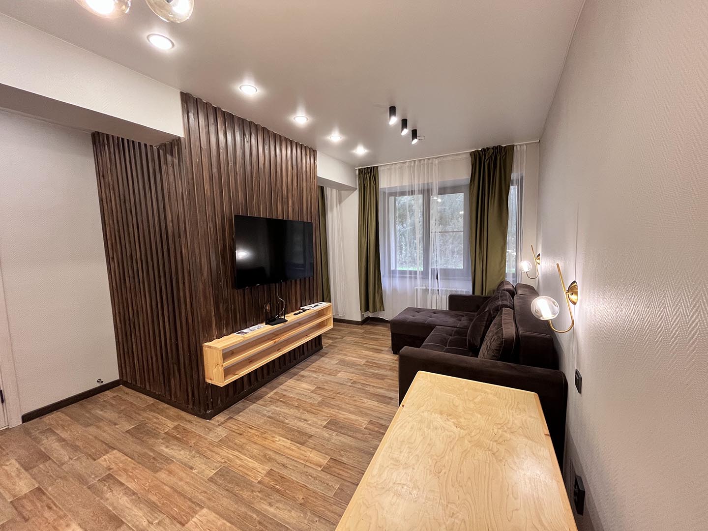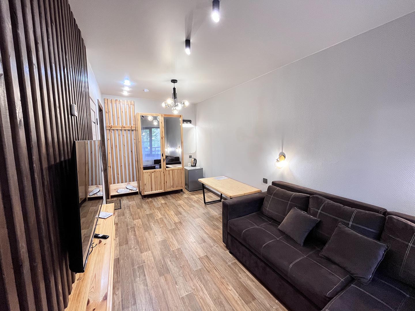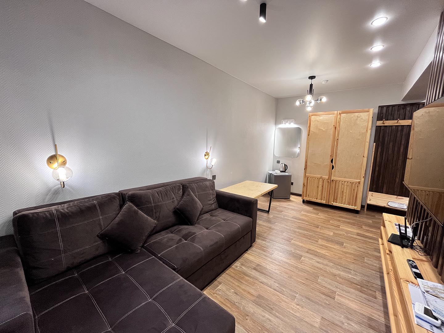 Совершенно новый номер в новом отеле, расположенный на первом этаже. Зайдя в номер, Вы сразу попадаете в большую комнату — «гостиную». В комнате имеется угловой диван, журнальная зона перед телевизором, чайник и холодильник для напитков. Спальная зона в номере представлена в виде отдельной комнаты с двуспальной кроватью.