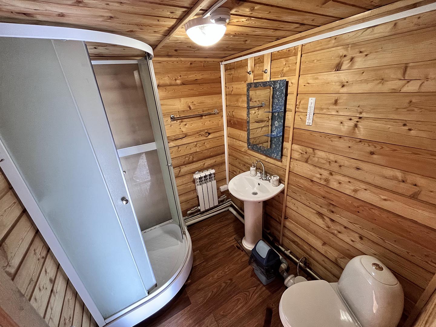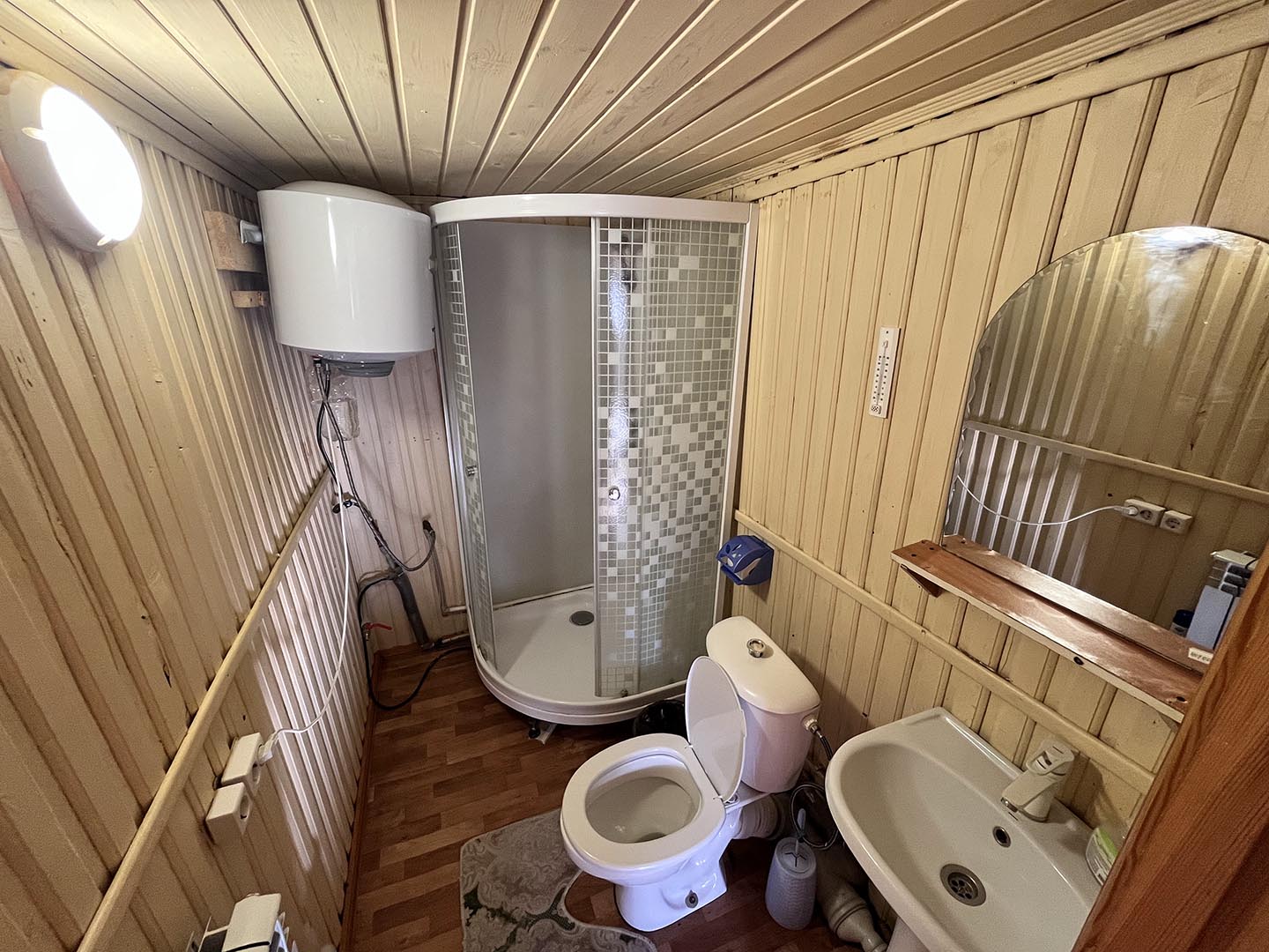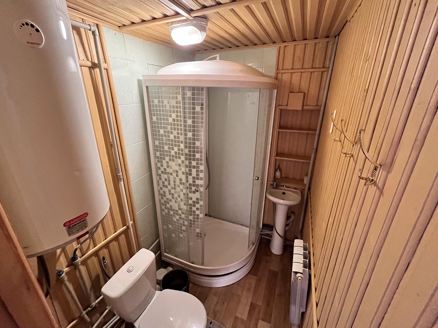 На первом этаже: раскладной диван, столовая зона со шкафами для посуды, посуда, чайник, стол, табуреты, вместительный двухкамерный холодильник, микроволновая печь, плазменный телевизор. Также на первом этаже расположен санузел с раковиной и душевой кабиной.