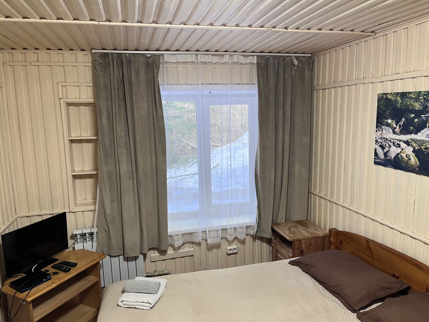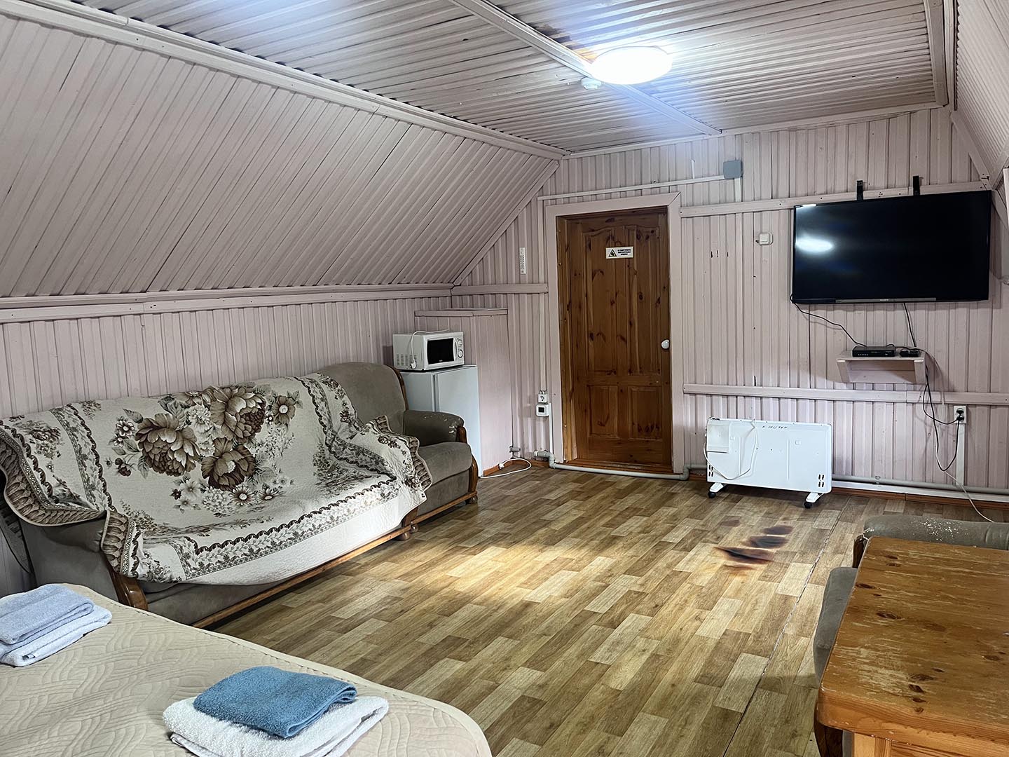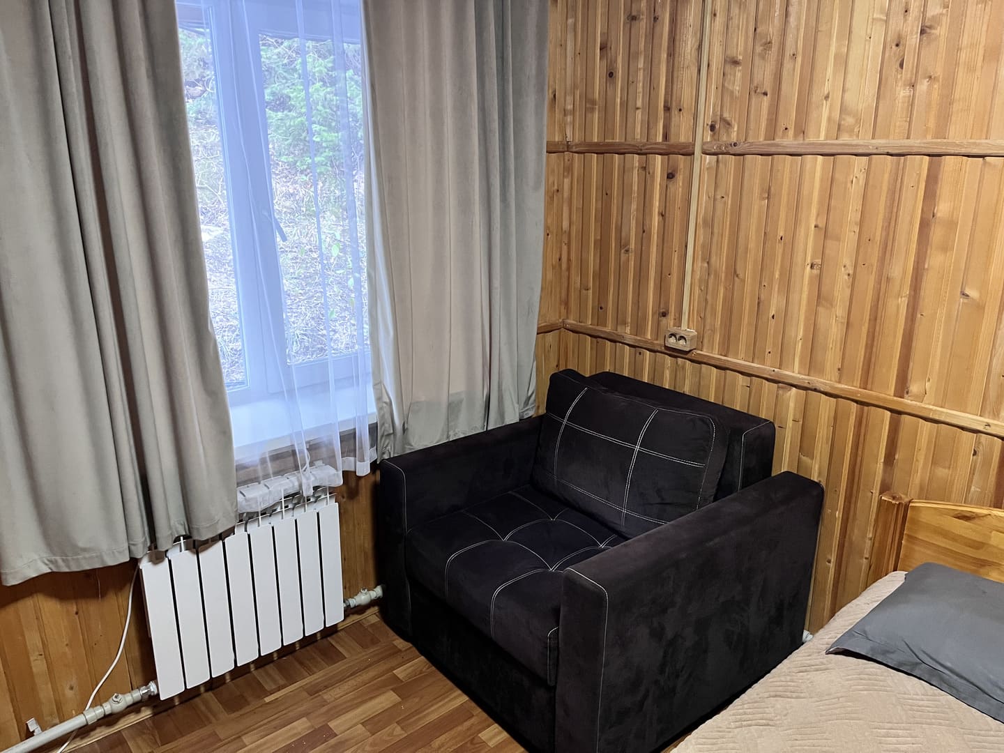 Уютный и комфортный номер с отдельным входом. Расположен на первом этаже Альпийского домика. В номере есть прихожая зона, из которой Вы сразу попадаете в большую комнату — «гостиную-спальню». В комнате имеется две совмещенные односпальные кровати с прикроватными тумбочками для хранения необходимых принадлежностей, большой телевизор и раскладной диван. В номере также имеется холодильник, микроволновая печь, чайник и необходимая посуда — чайные пары, стаканы. В номере расположена ванная комната с душевой кабиной, раковиной и санузлом. Также имеется сушилка для одежды. Постельное белье и полотенца входят в стоимость номера.