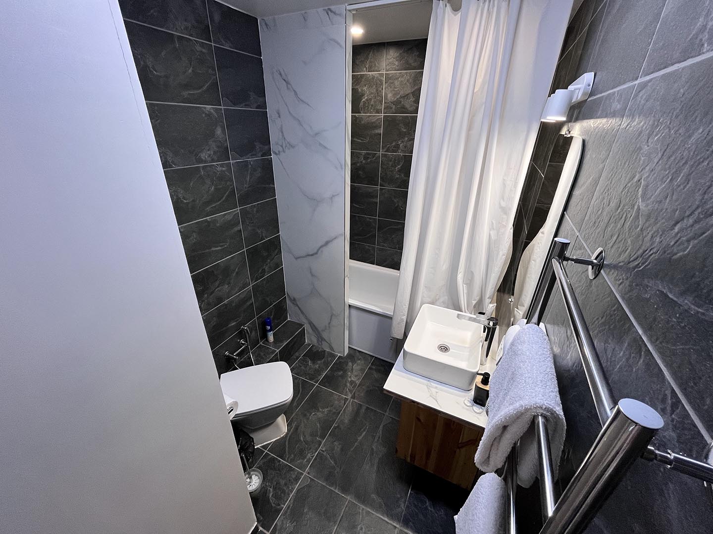 Войдя в номер, Вы оказываетесь в большой прихожей, из которой можно попасть во все остальные комнаты: спальню-гостиную, спальную комнату, комнату с санузлом, душем и раковиной, а также кладовую для хранения вещей и снаряжения.