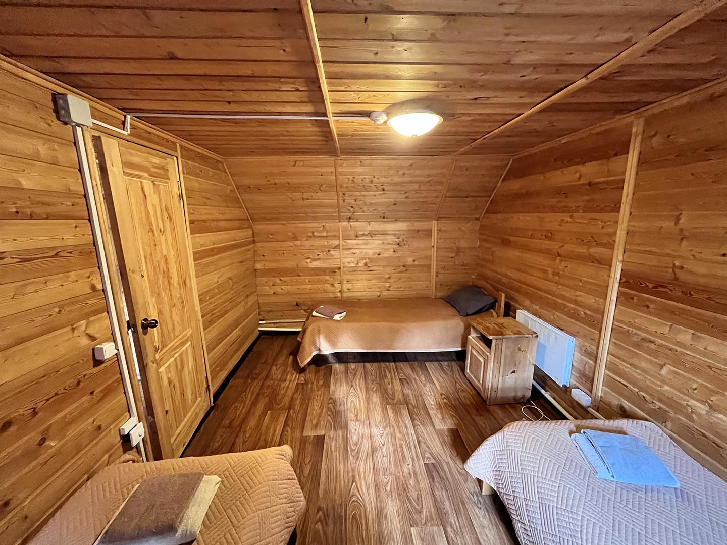 Для организации спальных мест, в номере располагаются 2 деревянные односпальные кровати. Для каждой кровати отведена отдельная тумбочка, в которую можно сложить необходимые принадлежности. У входа расположена вешалка для одежды, зеркало. Душа и санузла в номере нет, удобства находятся на первом этаже. Также в номере имеется сушилка для одежды. Постельное белье входит в стоимость номера.
