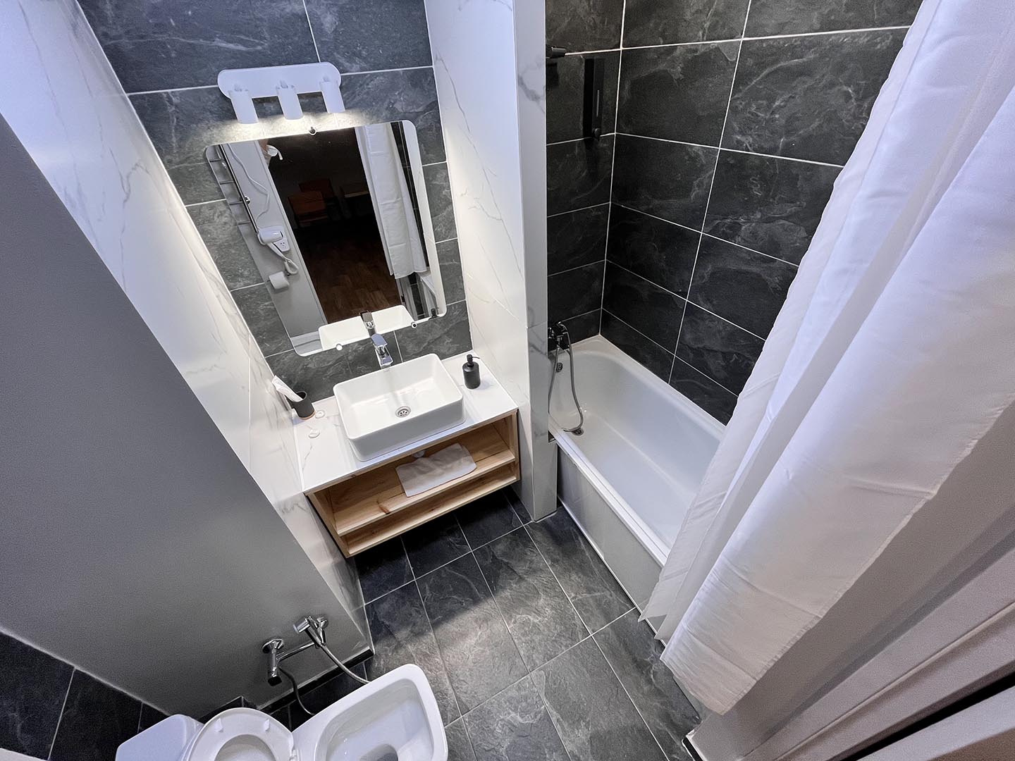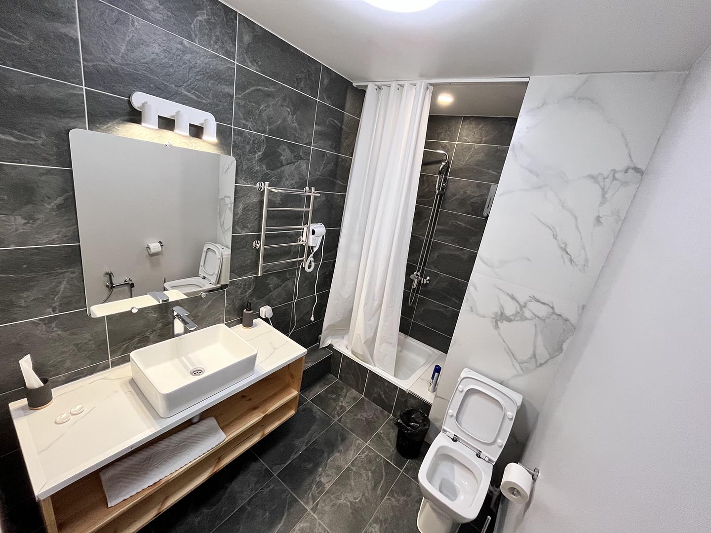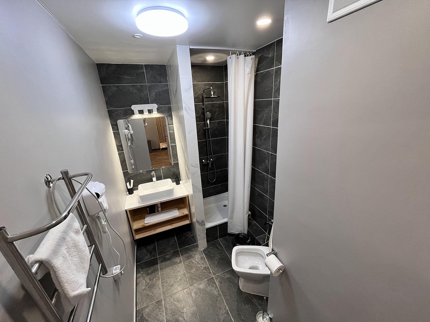 В данном номере есть ТВ со спутниковым телевидением, деревянный стол со стульями, электрический чайник и чайные пары. Также в номере имеется сушилка для одежды. Постельное белье и полотенца входят в стоимость номера.