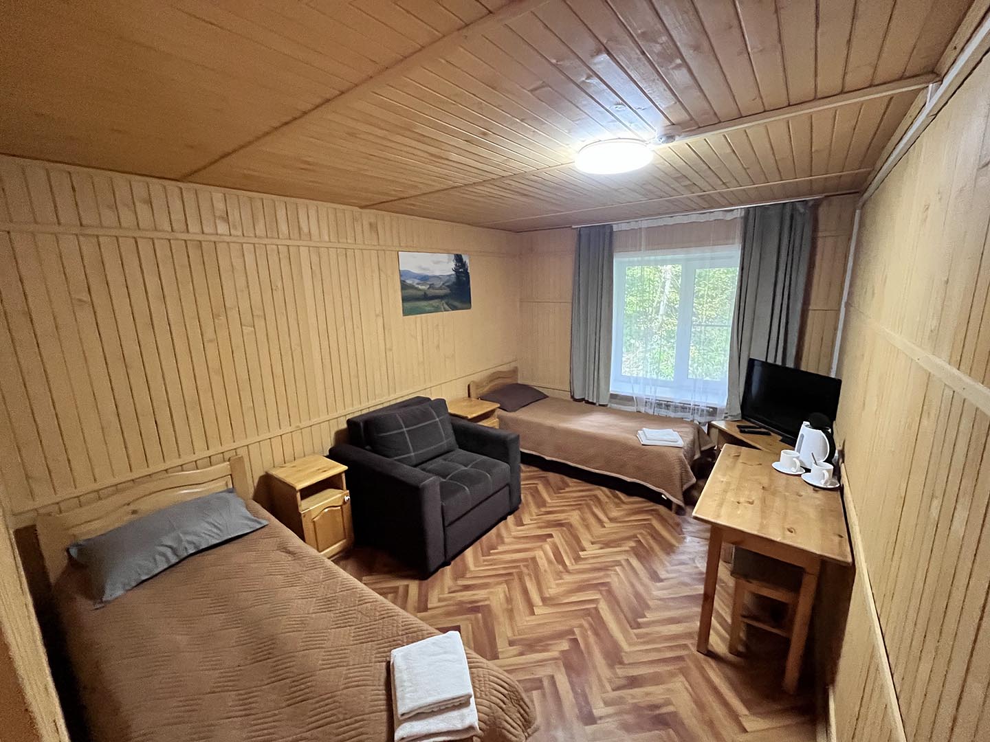 Для организации спальных мест, в номере располагаются 3 деревянные односпальные кровати. Имеется ванная комната с душевой кабиной, раковиной и санузлом. Для каждой кровати отведена отдельная тумбочка, в которую можно сложить необходимые принадлежности. У входа расположена вешалка для одежды, зеркало. В данном номере есть ТВ со спутниковым телевидением, деревянный стол со стульями, электрический чайник и чайные пары. Также в номере имеется сушилка для одежды. Постельное белье и полотенца входят в стоимость номера.