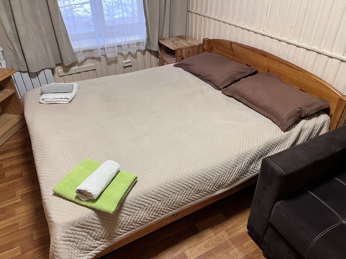 В спальне расположены три односпальные деревянные кровати с большим комодом. В номере имеется сушилка для одежды. Постельное белье и полотенца входят в стоимость номера.
